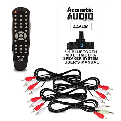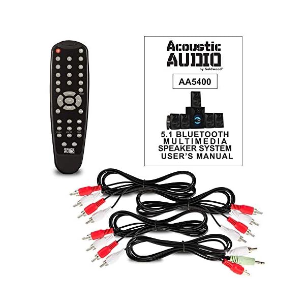 What’s in the box – Acoustic Audio by Goldwood AA5400 powered subwoofer speaker 5 passive wired satellite speakers full function remote 3 5mm to RCA cable 3 RCA to RCA jack cables instruction manual