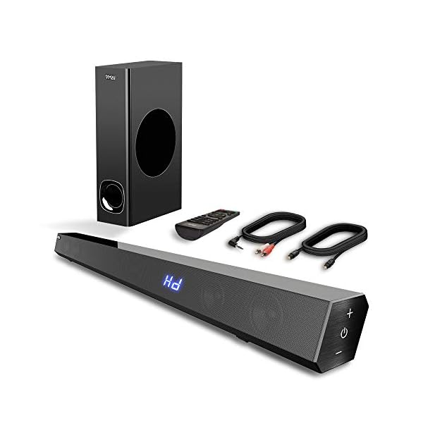 VMAI 2.1 Sound Bar with Subwoofer, 120W, Bluetooth 5.0, HDMI/Optical/Auxiliary/USB, Jet Black, 34 Inch, Wall Mountable, Bass Adjustable Surround Sound for Home Theater