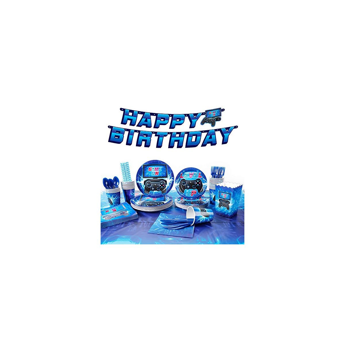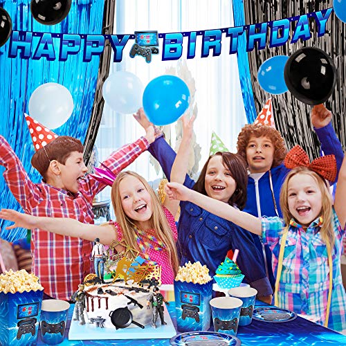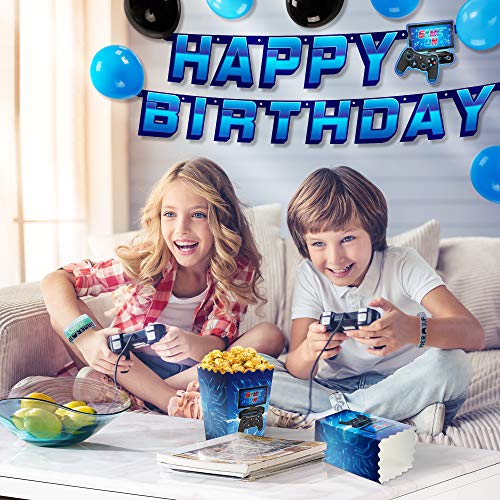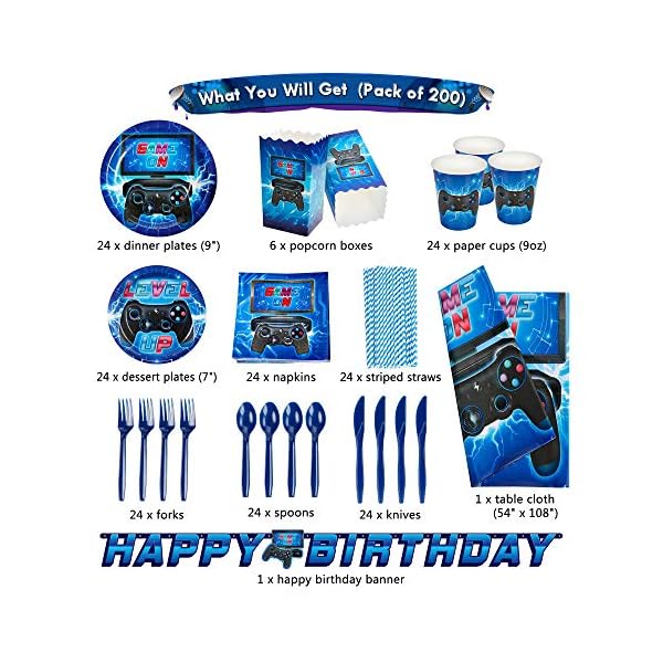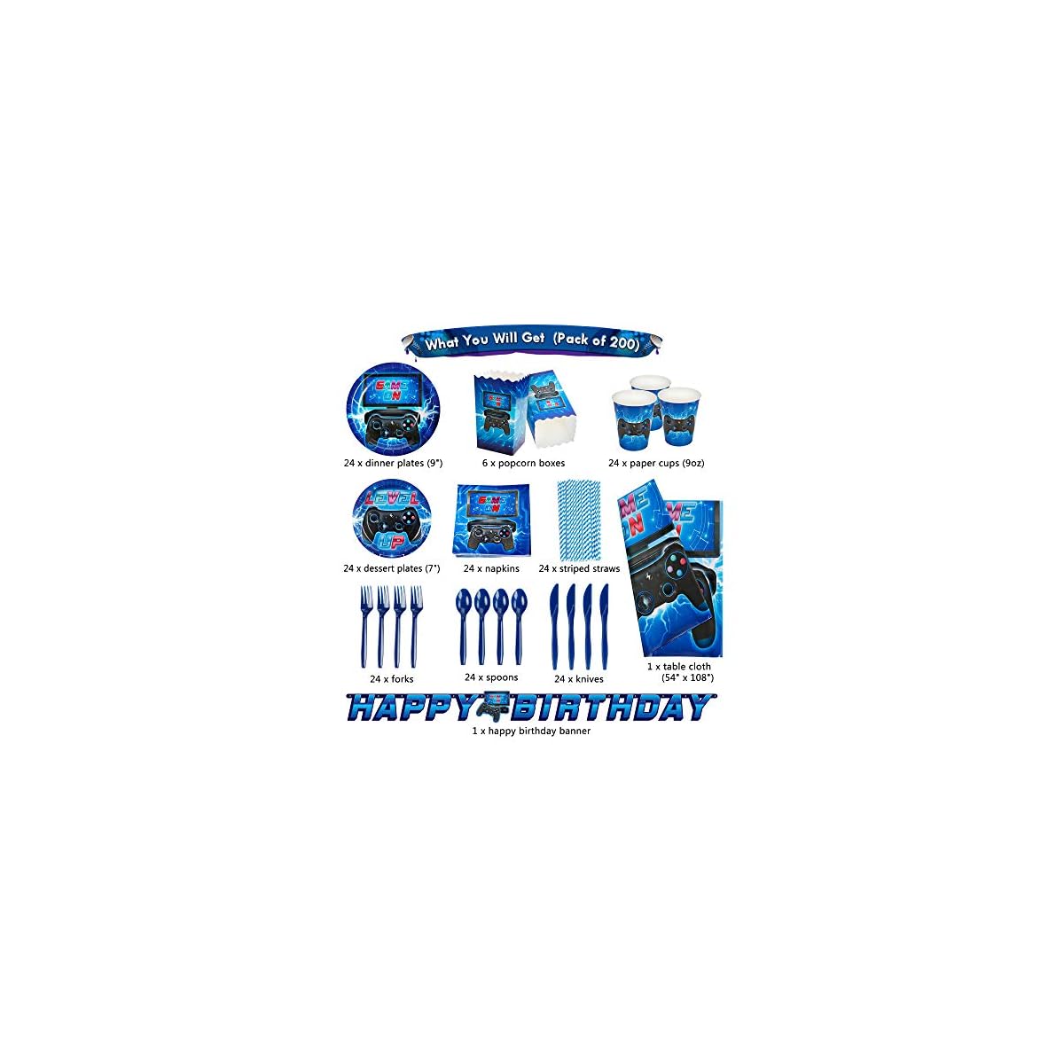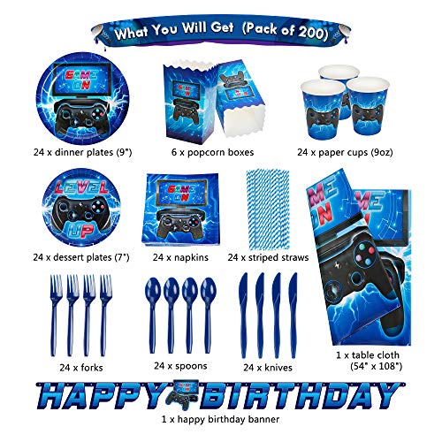 DECORLIFE 200PCS Video Game Birthday Party Supplies Serves 24, Game on Birthday Party Supplies for Boys Include Tablecloth, Popcorn Boxes, Gaming Party Decorations