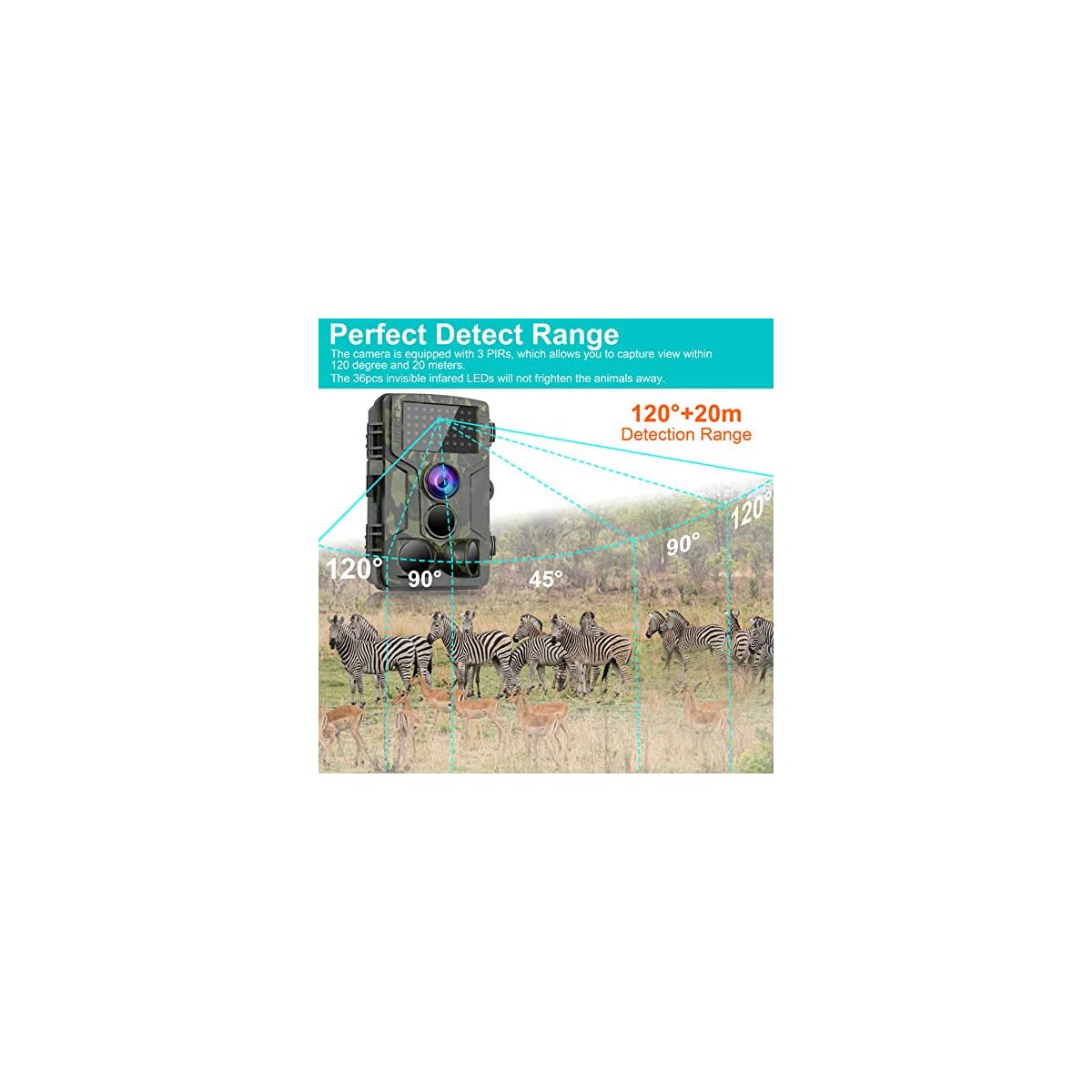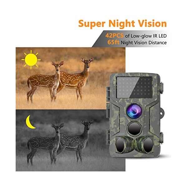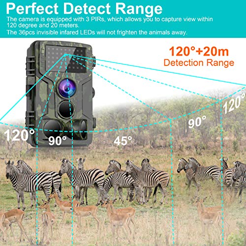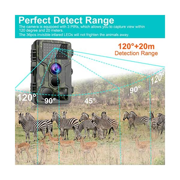 ✅ 【High-sensitive PIR sensors】With three high sensitive PIR sensors(also adjustable), the hunting camera can capture every breathtaking moment within up to 120 degree detection range and 65ft/20meters detection distance. The 36 pcs upgraded infrared LEDs with 940nm invisible-light technology allow you to record incredible videos and photos, avoiding disturbing or spooking your hunting target.