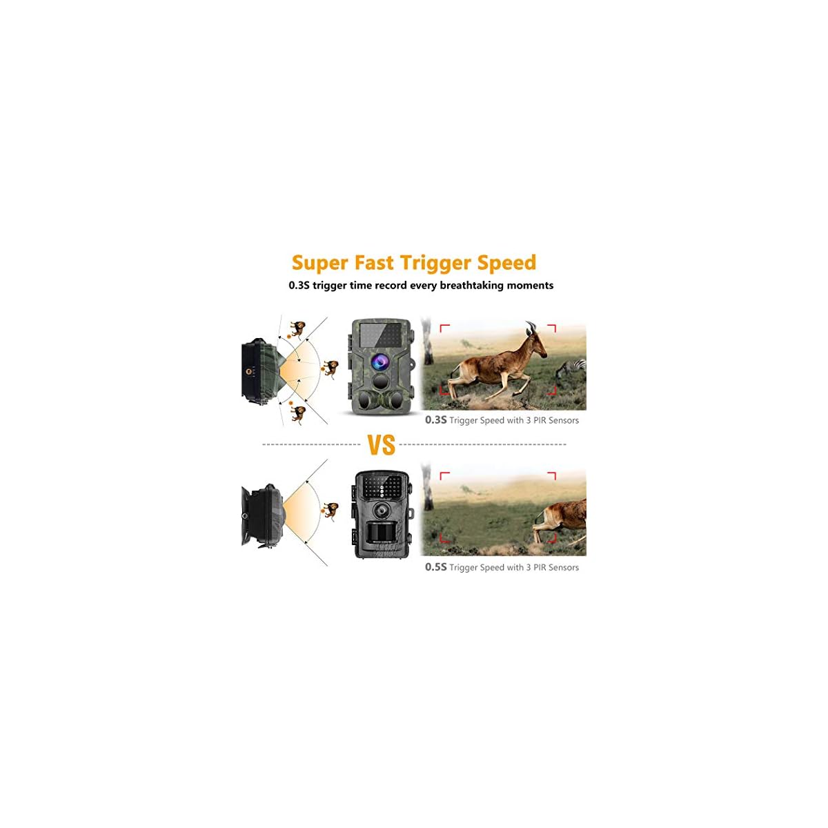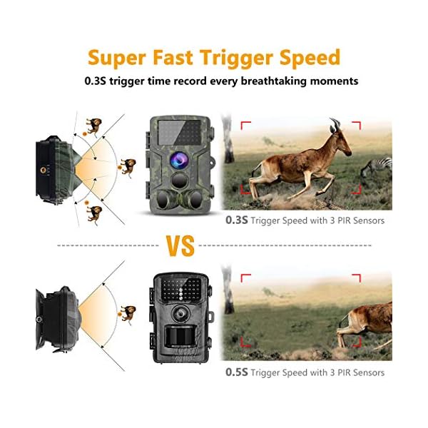 ✅ 【Fast Trigger Speed & Long Working Time】Our trail camera features an impressive trigger speed of 0.3 second, which allows it to record every exciting moment of the detecting places. Besides, the camera has an incredible-long standby time of up to 6 months when powered by 8 AA batteries and even longer when connecting to the solar pane(Not included). IDEAL CHOICE FOR SCOUNTING WILDLIFE!