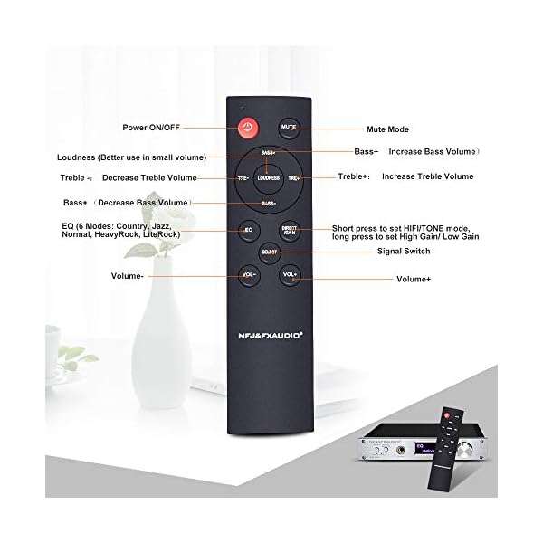 【Multiple Sound Modes】The multi-functional remote control can set HIFI mode, high gain mode, low gain mode, treble control, bass control, total volume control, loudness and six EQ sound effects modes including country, jazz, rap, normal, heavyrock, literock. More remote control operation instructions, please check the manual and pictures. Remote doesn’t contain battery. Two packs of 1.5V AAA batteries are needed
