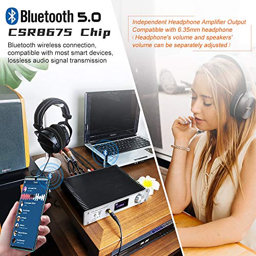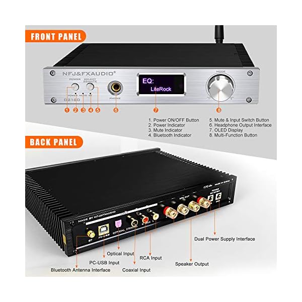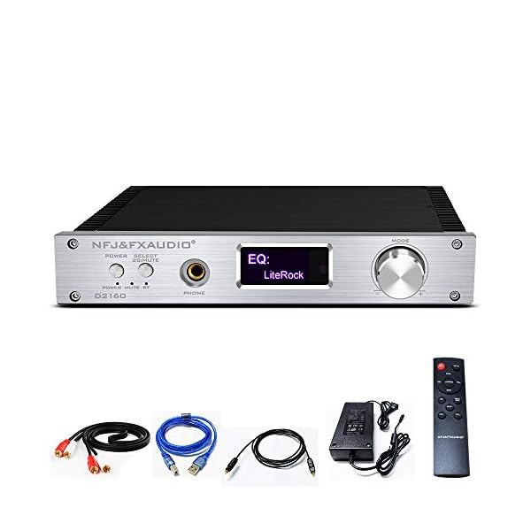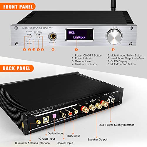 FX AUDIO 150W+150W Bluetooth Stereo Amplifier and Headphone Amp Optical Coaxial PC-USB RCA Input CSR8675 Bluetooth 5.0 Amp with OLED/Remote/Power Adapter/DSP/Six EQ for Home Audio System (Silver)