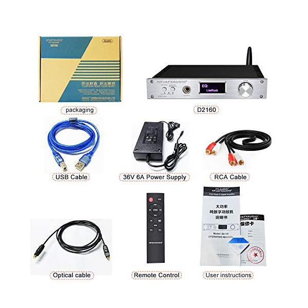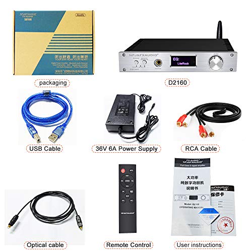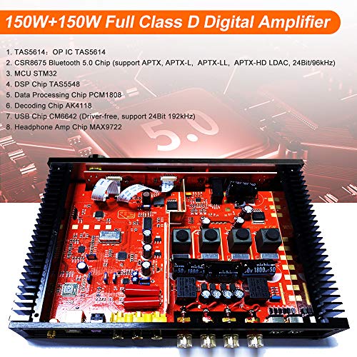 【150W Amplifier with High Performance】 This D2160 amplifier is a full digital signal transmission power amplifier with a 1.54-inch OLED display. Adopting TAS5614 chip with 150W + 150W power which can directly drive floorstanding speakers. When necessary, two power supplies can provide power at the same time to increase power output. Using high-quality MCU STM32, PCM1808 digital processing chip, AK4118 decoder chip, Siemens Melaleuca capacitor, audio special inductance