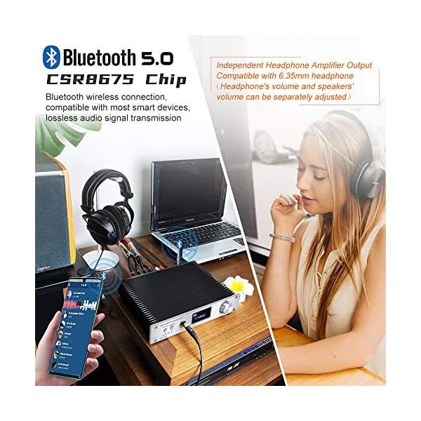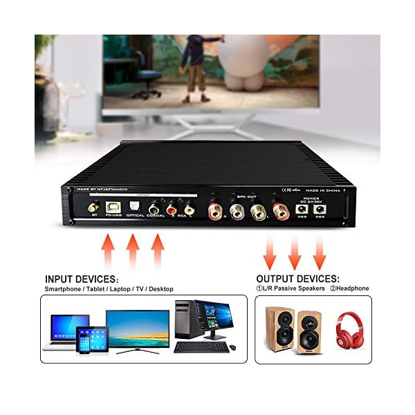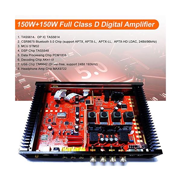 【Support APTX-HD Format】Includes Bluetooth, optical, coaxial, USB (PC-USB, with decoding function), RCA. Bluetooth 5.0 module uses CSR8675, supporting APTX, APTX-L, APTX-LL, APTX-HD LDAC and other lossless formats, with 24Bit/96kHz sample rate. The USB chip uses CM6642, which is driver-free and supports 24Bit/192kHz