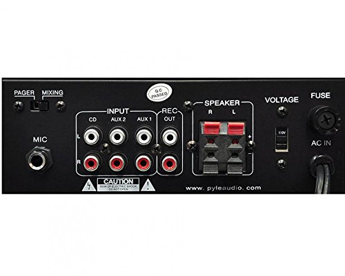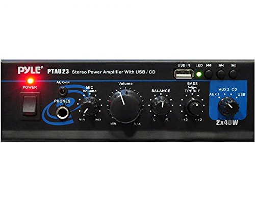 PyleHome Model : PTAU23 Mini Stereo Power Amplifier, 2 x 40 Watt Mini Stereo Power Amplifier – 2 x 40 Watt with USB, AUX, CD & Mic Inputs RCA REC Output 1/4″ Phone Jack 1/4″ MIC Input Jack USB Reader Function Power On LED Indicator 110/220 Voltage Selector AUX1, AUX2, CD & RCA Inputs 2 x 40 Watt Peak at 4-Ohm Four Push Type Speaker L/R Terminals Switchable MIC Pager and Mixing Modes Switchable AUX1, AUX2, CD, USB Inputs Bass, Treble, Balance, Master & Mic Volume Controls Dimensions:7.48″W x 2.72″H x 5.39″D Pyle PTAAU23 Home Amplifier is perfect for powering any stereo system. Complete with USB and AUX inputs, and 2 x 40 watts of power – this simple to use and durable amp has bass and treble controls, a slick blue LED output level display, L/R RCA inputs, and 4 speaker outputs. Using sophisticated circuitry and premium components for uncompromising musicality – this product is famous for delivering powerful and accurate sound. This small but powerful amp delivers clear and crisp audio for it listener. Durable and affordable, this amp is made to last.