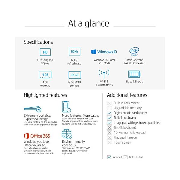 Home Computers HP Stream 11.6-inch HD Laptop, Intel Celeron N4000, 4 GB RAM, 32 GB eMMC, Windows 10 Home in S Mode with Office 365 Personal for 1 Year (11-ak0020nr, Diamond White)