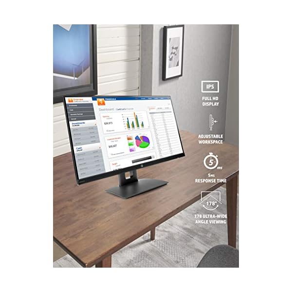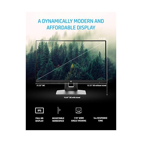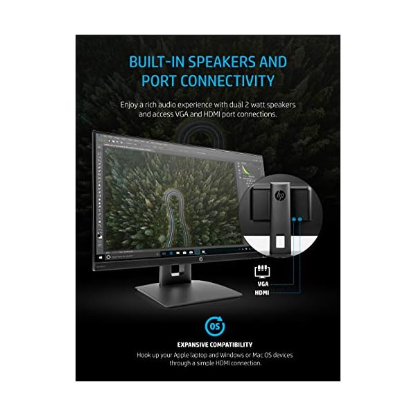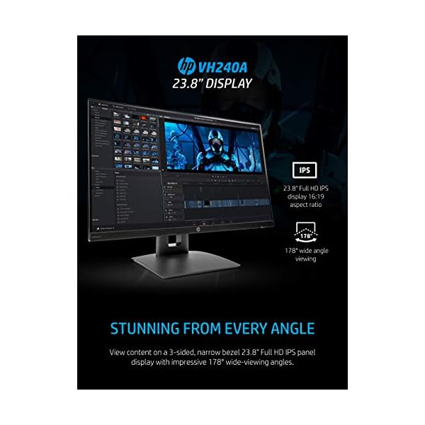 Get the best productivity from home or at the office with the virtually borderless HP VH240a 23.8-Inch display featuring an ergonomic stand, built-in speakers and an ultra-slim design at a competitively low price point. Great for projects requiring portrait and landscape mode screen rotation, the VH240a also includes a 178° positional viewing angle for the best quality no matter where you sit. You can also mount the display on a wall or arm bracket with a 100m VESA mounting pattern located on the back of the monitor arm. Connect your Windows, Mac, or any laptop featuring an HDMI port with an included HDMI cord. The video card of the connected PC must be capable of supporting 1920 x 1080 at 60 Hz and include 1 HDMI or 1 VGA output to drive the monitor at the preferred mode.