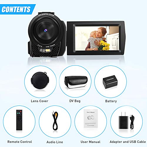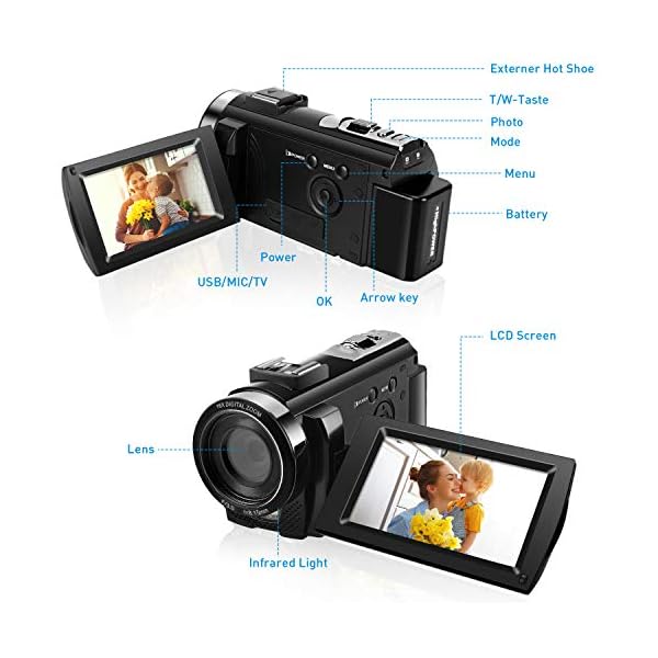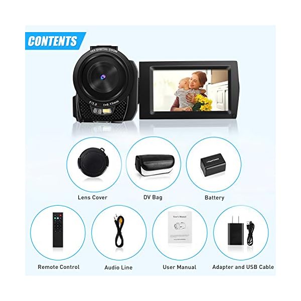 【PORTABLE CAMCORDER+WARRANTY】The camcorder is small and lightweight, portable for you to carry around. The camcorder can support external LED light and standard tripod(LED light and tripod are not included in the package). If you have any problems or concerns, please don’t hestitate to contact us.We promise you 60 days free return & 360-day free replacement warranty.