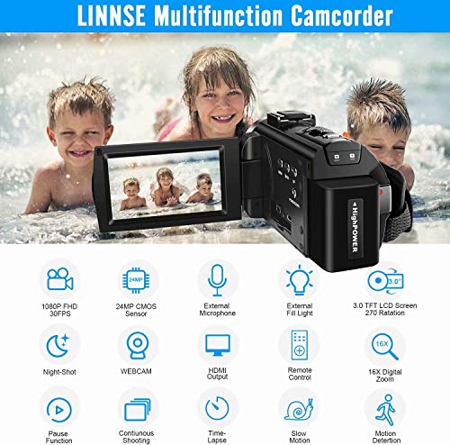 【1080P+3.0 inch IPS Screen】This video camera max supports 1080P(15FPS) AVI Video Resolution, 24M(6000×4500) JPEG Image Resolution. 3.0 inch IPS Screen and supports 270°rotation, 16X digital zoom, built-in fill light, Anti-shaking, Face Capture, Beauty Function, Self-timer, Webcam function, Pause function, USB 2.0, TV Output and so on.