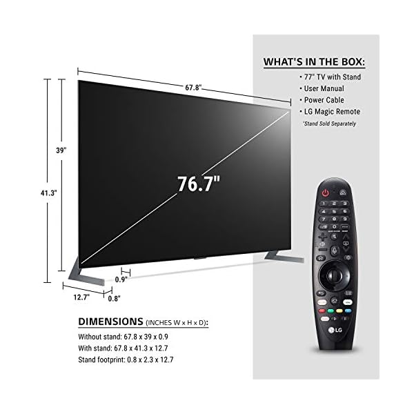 TV Dimensions with Stand (WxHxD) 67.8″ x 41.3″ x 12.7″, 88.6 lbs || TV Dimensions without Stand (WxHxD) 67.8″ x 39″ x 0.9″, 86.9 lbs