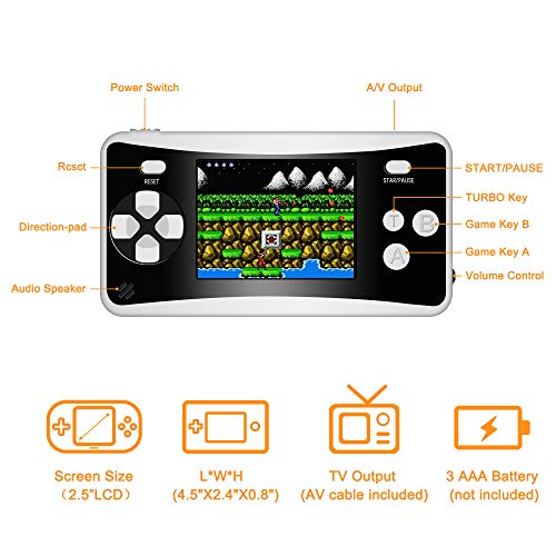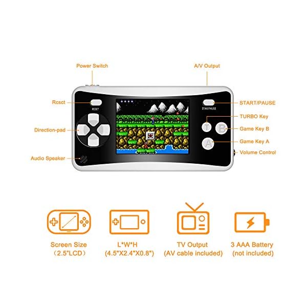 【PLYA Anytime, Anywhere】: Convenient portable size and Lightweight, it is perfect for playing travel or on the go. You just need to put 3 AAA batteries in the console, that is very portable and easy to carry.