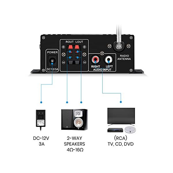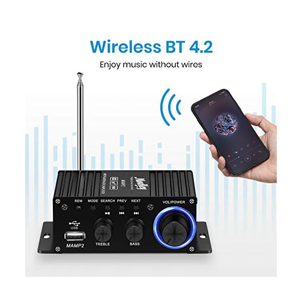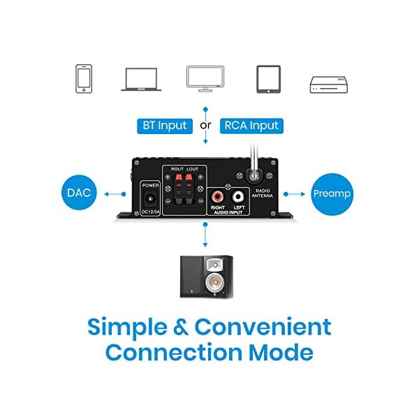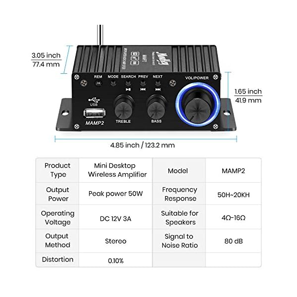 Multiple Input Sources: This small stereo amplifier supports AUDIO/ USB / wireless connection. Easily connected to external audio sources such as DVD / TV / Computer/ Phones/ ipad / MP3 player via the RCA (L/R) of audio input. And through USB input, you can connect the amplifier to a USB flash drive, supporting music formats including MP3 / APE / WAV / WMA, etc.