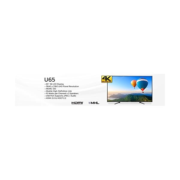 With 4K UHD, 8 million pixels illuminate an extraordinary depth and range in every image on this 65″ screen Scepter 4K Ultra High-Definition displays have 4 times the number of pixels as a Full HD display, turning your shows into an epic UHD viewing experience HDMI 2.0: Explore all the 4k content that you want without sacrificing streaming performance HDMI 2.0 is compatible with all previous HDMI versions so any HDMI equipped device will doHDCP 2.2 guarantees that all 4K material is copyright protected and will readily stream all 4k content that is available currently and in the futureMHL (shared with HDMI 1 port): Stream all of the content from your smartphone or tablet on the Scepter UHD to capitalize on visually enhanced picture quality Audio Return Channel (ARC): Send and receive all audio content on the Scepter UHD TV using one HDMI cable Consumer Electronics Control (CEC): Gain control of the TV and all connected devices (up to 15 total) all on one remote Impressively, also control the TV with the connected devicesMEMC 120: From battle scenes to car chases, MEMC 120 will smoothly transition through all fast-paced action sequencesUSB 2.0: Instantly skim through pictures and access stored music when a flash drive is inserted into the USB port.