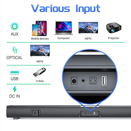 VARIOUS INPUT & WALL MOUNTABLE: The 2.0 Ultra-slim sound bars with multiple wired & wireless connection including OPTICAL, AUX input and USB (Flash drive only) is best for TV, Projector,Smart phone,Computer,Laptop,PS4,Blu-ray player,Tablet, XBOX and so on. Wall mountable, you can either place this speaker on desk either mount it on wall to save space