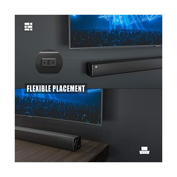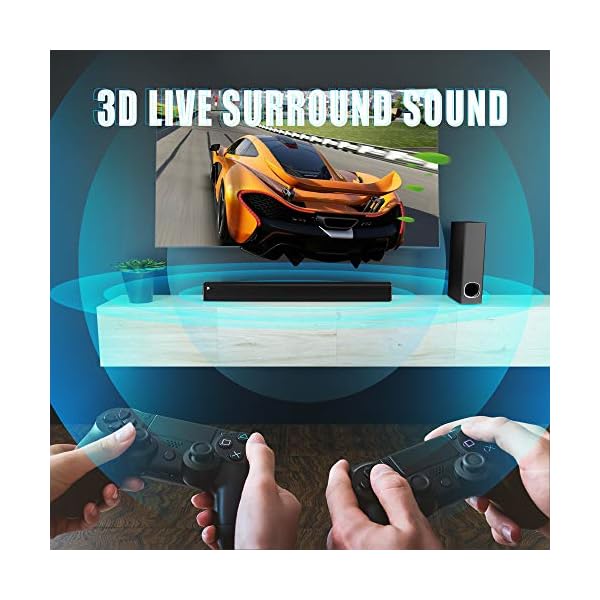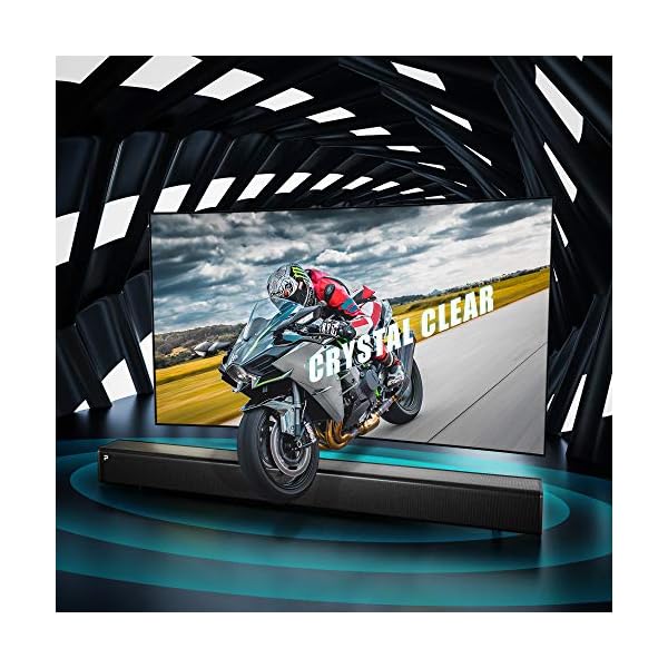 《 CRYSTAL CLEAR SOUND 》: 76H*78D*860L mm soundbar with 2*2.75inch treble drivers ,which larger than the general size on the market, providing you crystal clear sound with less than 1% total harmonic distortion, let you hear the every music notes beating on each violin string, and not miss every whistling of bullets piercing the air in the game.
