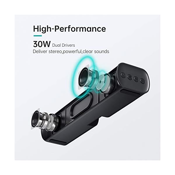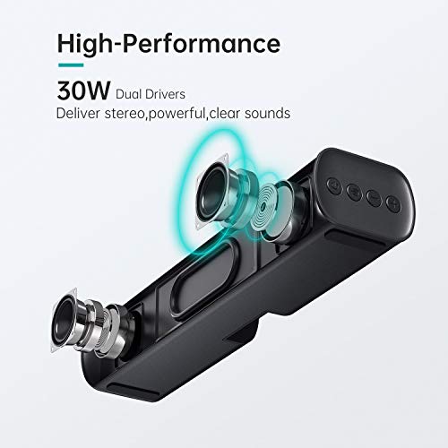 ✅【IMMERSIVE SOUND EXPERIENCE】SAKOBS TV Sound Bar features 2 powerful full-range speakers that produce an impressive high-quality stereo sound with low distortion degree that will not exceed 0.3% even with the maximum volume (not like the cheap sound bars out there). Upgraded to 50W RMS, 5x powerful than most 2x5w mini soundbar or 2.4 watts pc computer speakers; More than 110dB SPL for to get Deep Bass, Clear Vocals and CD-quality Sound.