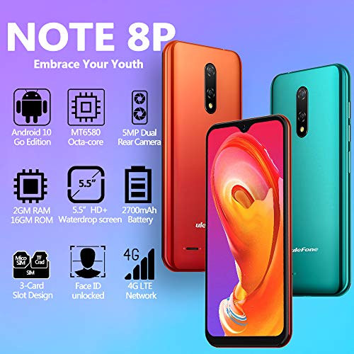 Ulefone Note 8 3G Unlocked Cell Phone, Android 10 Quad-core 2GB+ 16GB Expansion 128GB, 5.5 Inch Waterdrop Screen, 5MP+2MP+2MP Camera, Dual SIM 2700mAh Battery Unlocked Mobile Phone, GPS, Face ID