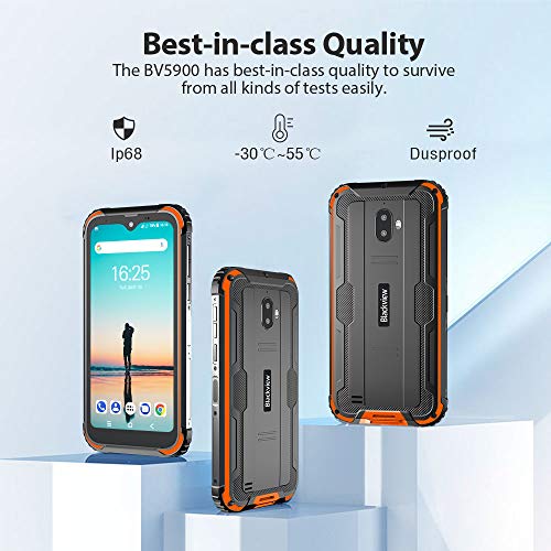 『A Reliable Rugged Phone』Support [MIL-STD-810G] Drop Proof and IP68 Waterproof, Blackview BV5900 can survive from 1.5m dropping, 2 hours immersion under 1.5m water and resist 99% of dust. Moreover, it can work normally in the temperature range of -30°C (-22°F) to 50°C (122°F). No more screen cracking, confidently take it with you to travel or outdoor sports.