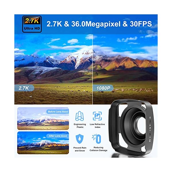 ★ Camera with Lens Hood & Remote Control: The camcorder comes with a lens hood. It can block excess light and protect your camcorder lens from accidental damage.It improves the photos overall color and contrast.This digital video camera comes with a remote control. Through the buttons, take photoes and videos by yourself, control TV playback or pause the camcorder videos from the remote place(Within 23FT). The webcam feature allows you to make video calls with your family and friends