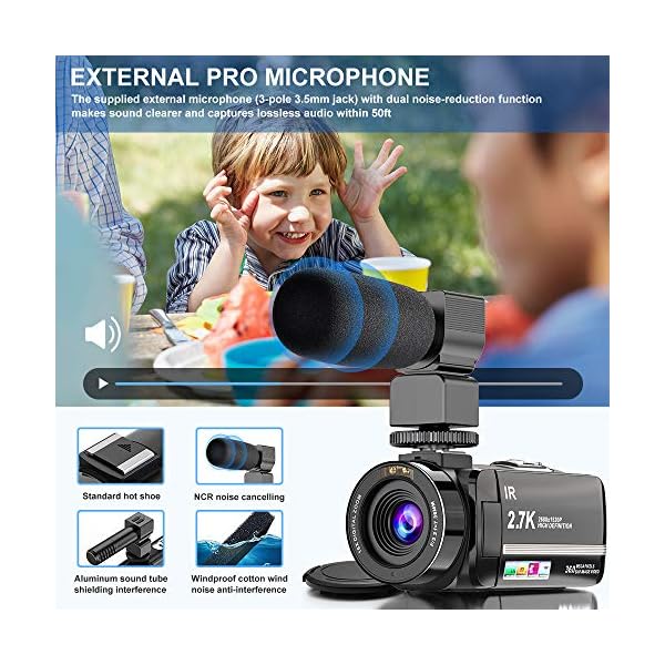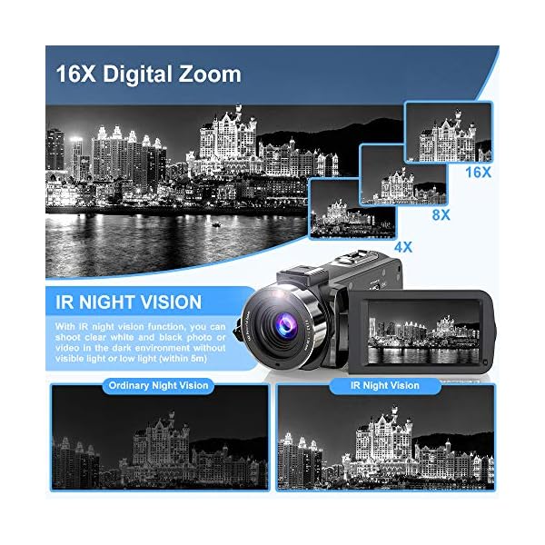★ IR Night Vision & External microphone: Under IR Night Vision, the camera can shoot high definition image videos, work perfectly in the darkness, also shoot great in low light. It Adopts X-Y stereo pickup technology, clear and stable sound image localization. It is the ideal video camera with microphone for bloggers and videography lover