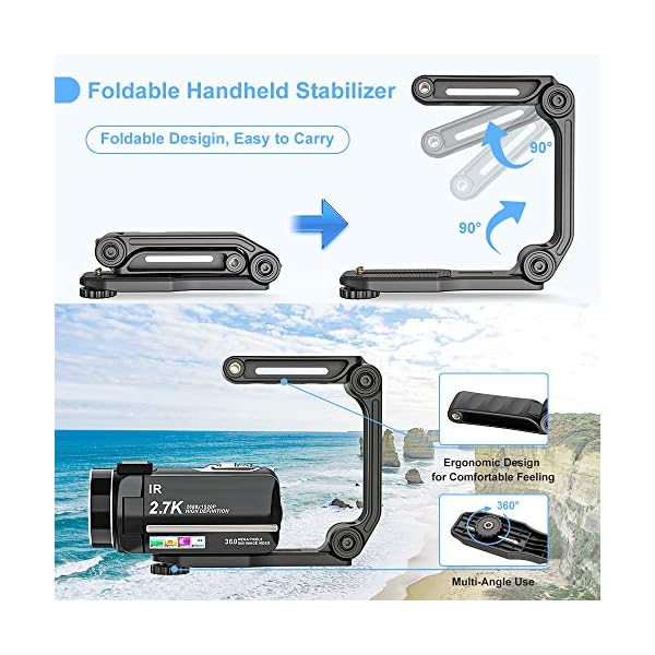 ★ Ultra HD 2.7K Camcorder with Handheld Stabilizer: Video camcorder with 2.7K 2688X1520/30fps (UHD) video resolution, 36.0 MP (max) picture pixel, The CMOS image sensor is 8.0 megapixels.3.0” TFT-LCD touch screen(supports 270°rotation), 16X digital zoom, Record while charging etc. Handheld Holder Keep the 2.7K camera stable when recording, Ideal for making moving low angle videos and images